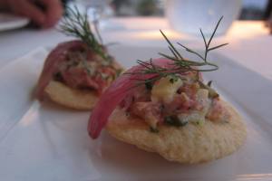 Service is attentive but discreet, friendly but professional. The wine list by the glass is relatively short but well-chosen: a robust glass of Barossa shiraz for myself and a local Pinot noir for my companion. We opt to share a couple of starters and main courses. We are served a delicious amuse bouche of mustard-tinged German meat salad on house made crackers.