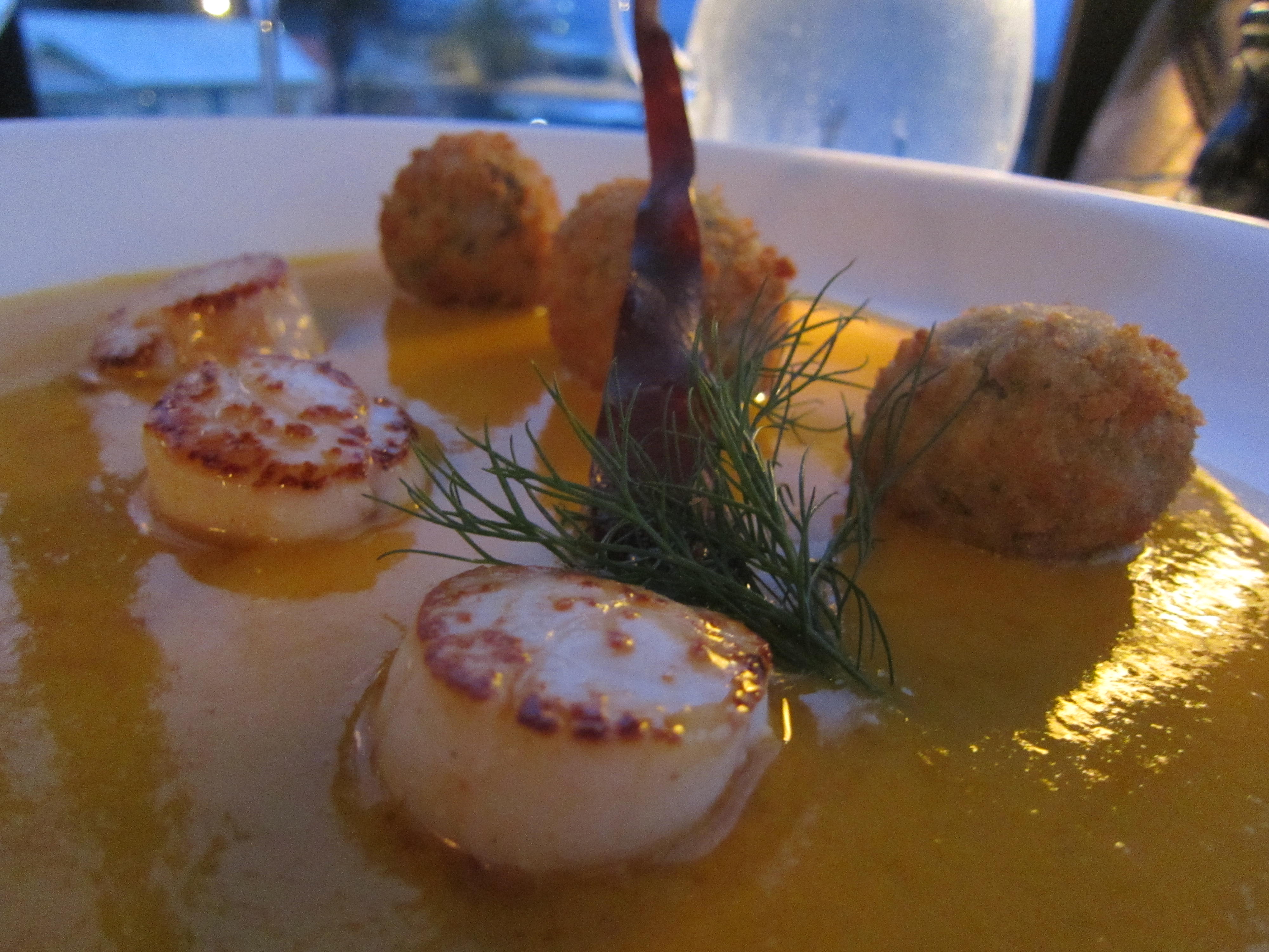 For our starters, fresh scallops are pan-seared and served with smoked Eden mussel croquettes on a puddle of wonderfully flavoursome corn chowder.