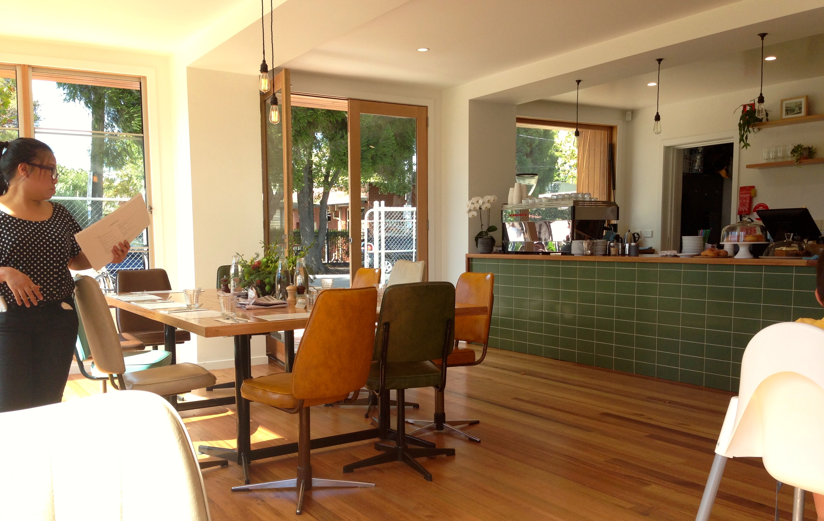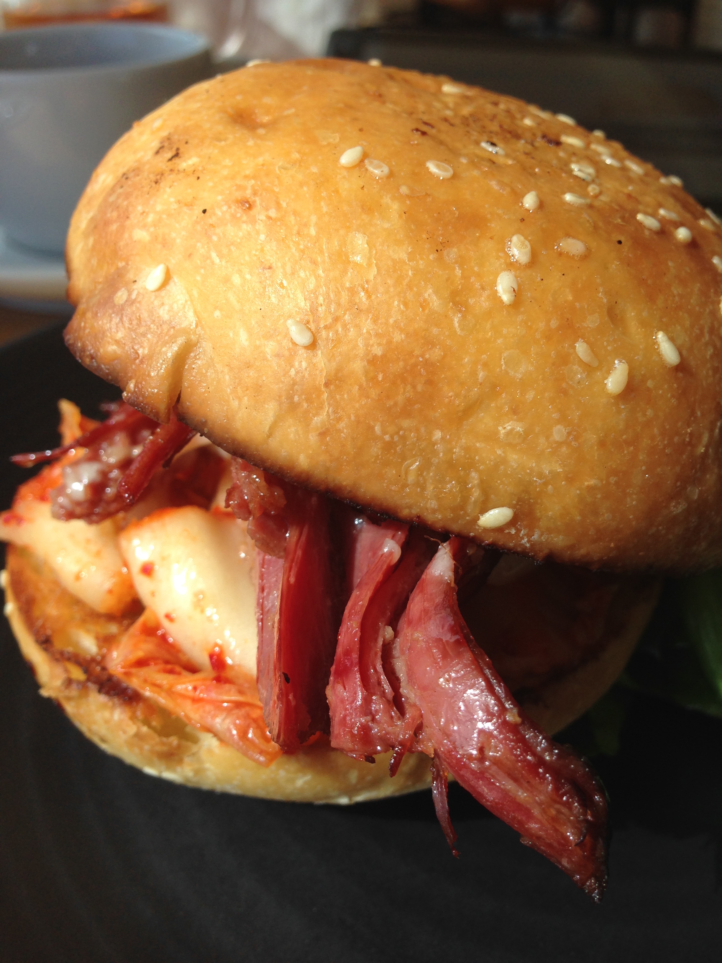 I head in on a warm autumn day for a spot of breakfast/lunch. There’s an all-day breakfast list as well as some more substantial bites from 11am. It’s noon and I am too hungry to decide. It’s an interesting menu of modern Australian basics, with a clear Asian twist as an homage to the local area. My kind waiter waits patiently as I talk myself out of my “normally, usually” breakfast of poached eggs on toast, roast tomato and avocado (all of which are available) and into a sandwich. The soft shell crab bun looks most tempting but I am told the celery is built into the slaw, so I opt for the smoked brisket, kimchi and asiago cheese creation, all served on a warm Zeally Bay bun. “You’re making the right decision”, I am told. My “very weak English breakfast tea, half strength please” comes out perfectly brewed with the tea leaves removed and an assurance that they will make it again for me if it’s not right. I don’t have to wait long for my bun, served with a dollop of fresh greens.