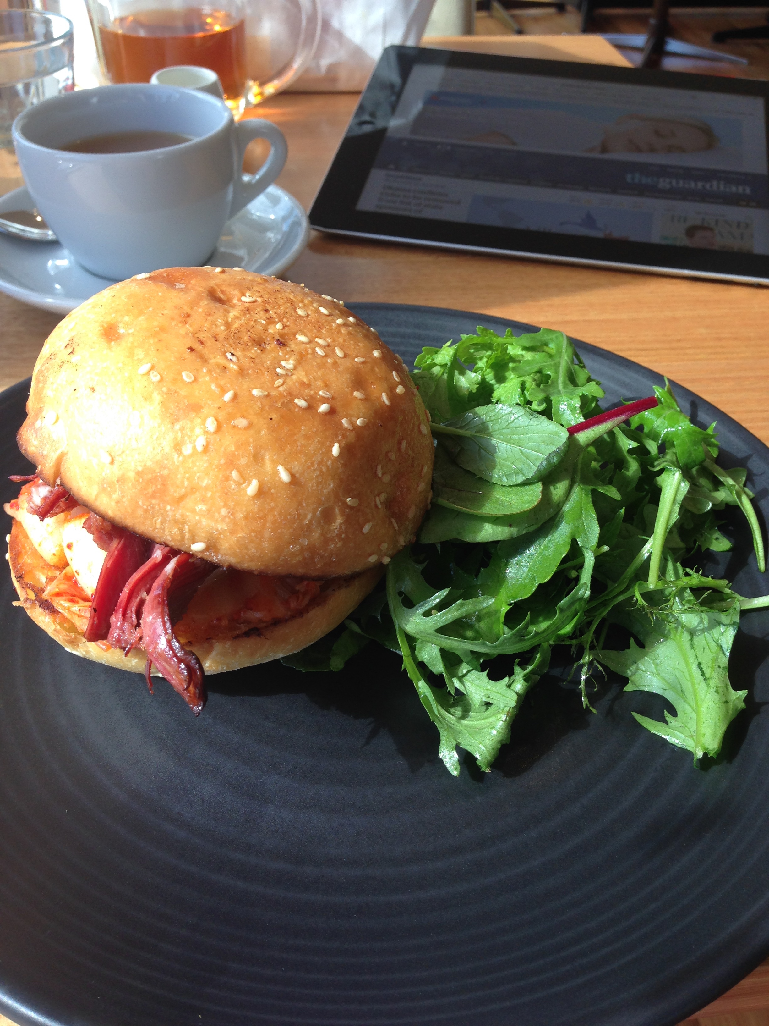 The brisket is a delicious oblong slab of meat, the cheese already melted as far as I can tell. The vegetables are a little too chunky to be helpful in a burger-type arrangement, and huge squares of bok choi stem prove impossible to bite through, as does the meat at times given its bulk. The bun is, helpfully, substantial enough to hold the whole thing together but it’s a messy job. By the time I’m finished my hands and face could really do with a wet wipe. It’s delicious. I’ll come back another day to try them on my “normally, usually” breakfast. Not sure if it will become a regular haunt, as it looks a tad too child-friendly a space for this child-free diner. But lovely to have on the doorstep for sure.