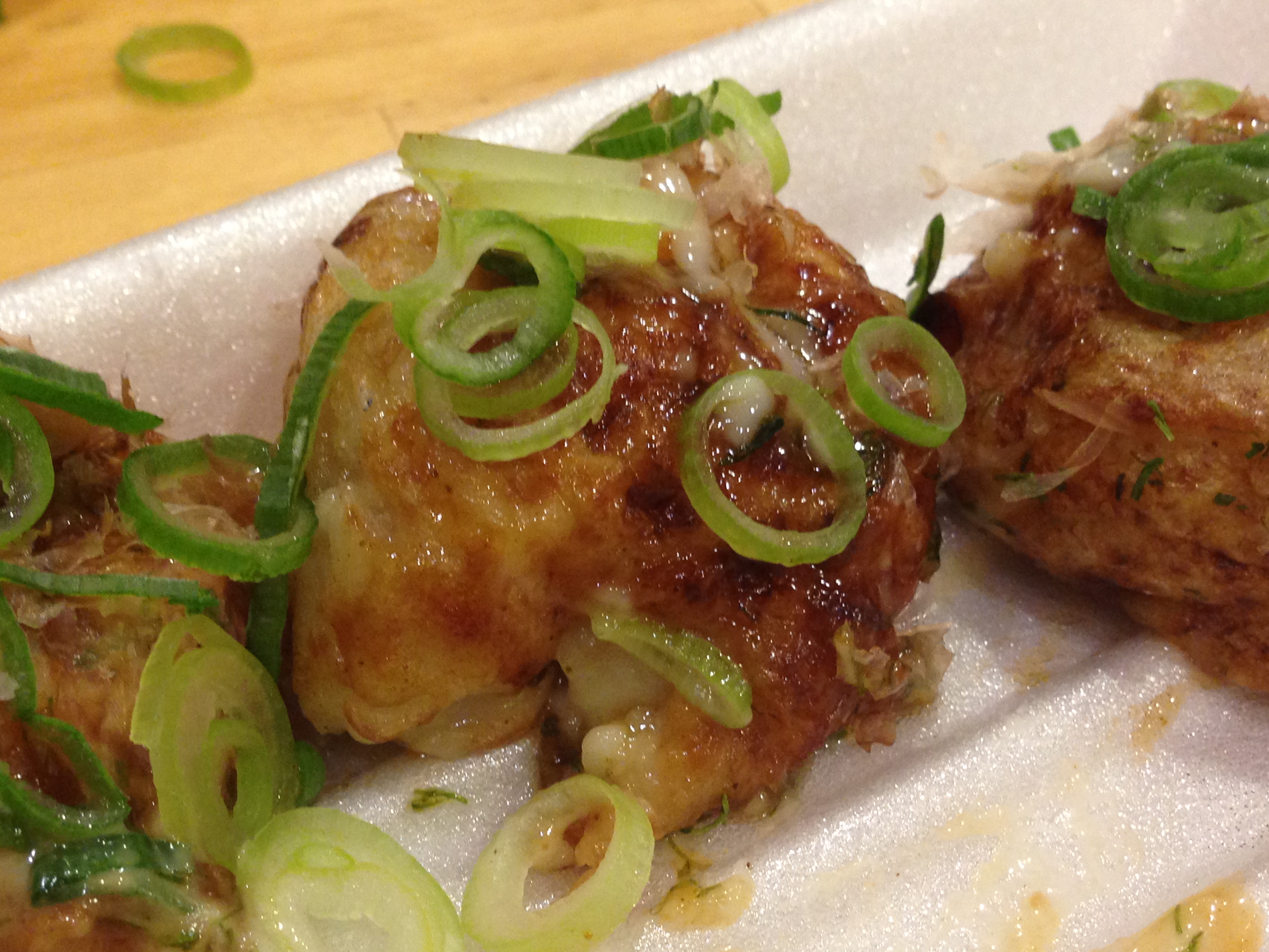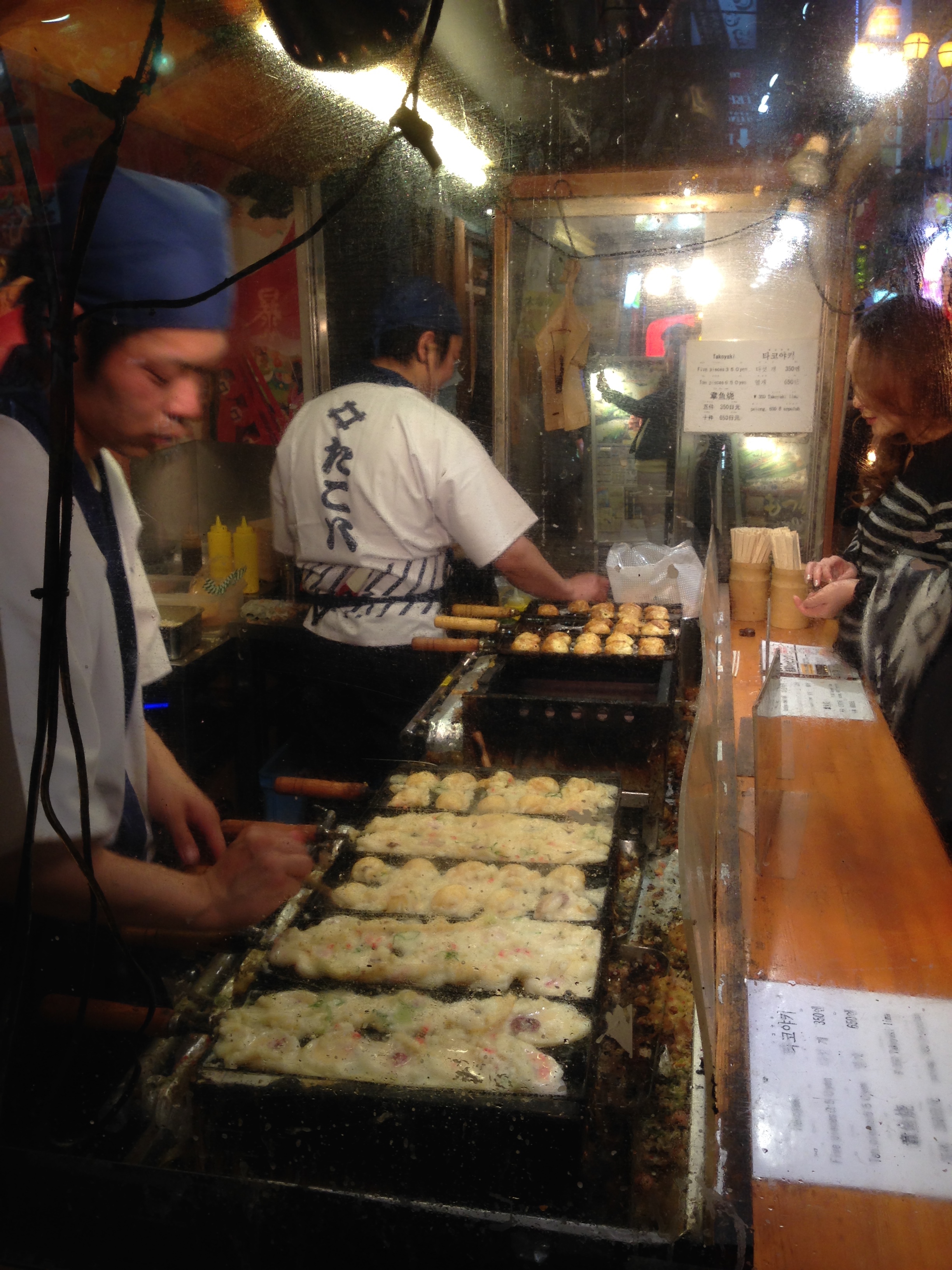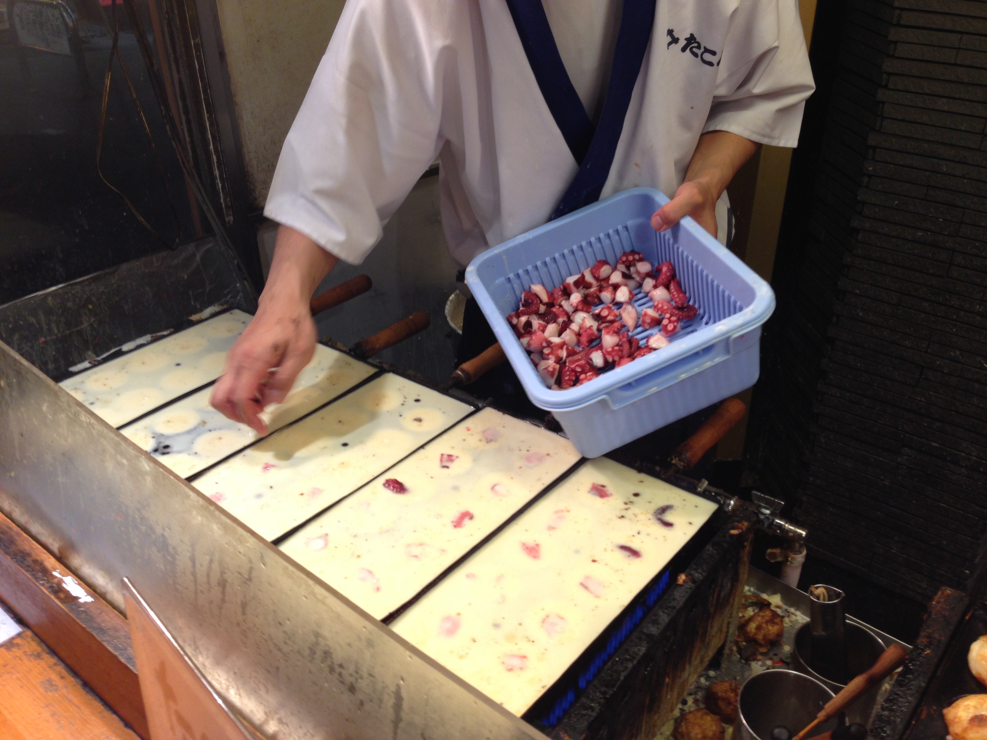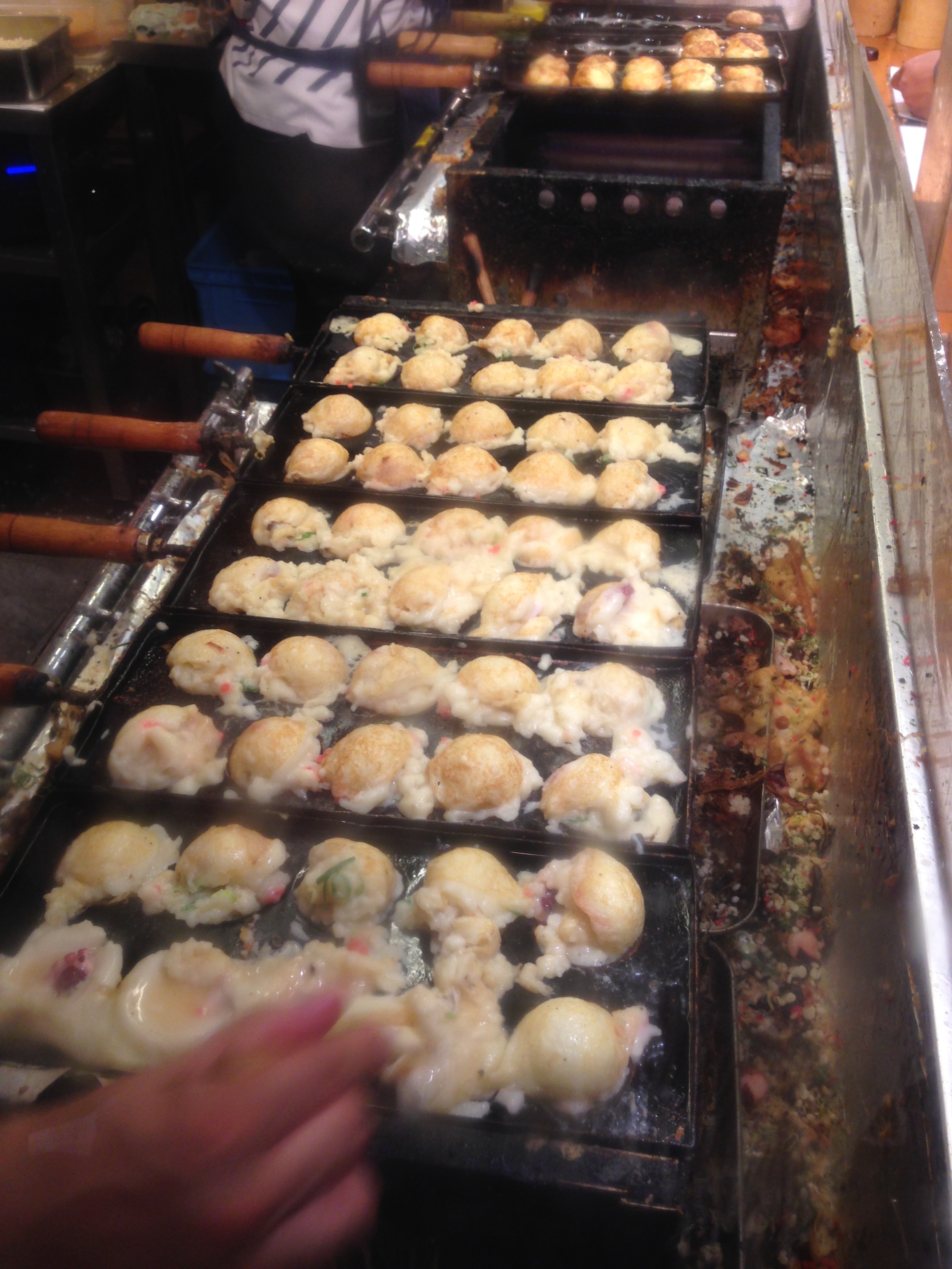 Osaka loves takoyaki, a cheap street food otherwise known as octopus balls. They are cooked in what looks like a poffertje pan. The cook throws a small chunk of octopus into each circular depression and adds a pancake-type mix in on top. Most sprinkle in tempura scraps (which frankly look like Rice Krispies to me) and some spring onion and/or pickled ginger. The takoyaki-wrangler uses a long bamboo skewer to coax the mixture into perfect spheres, as the queue grows longer and longer.