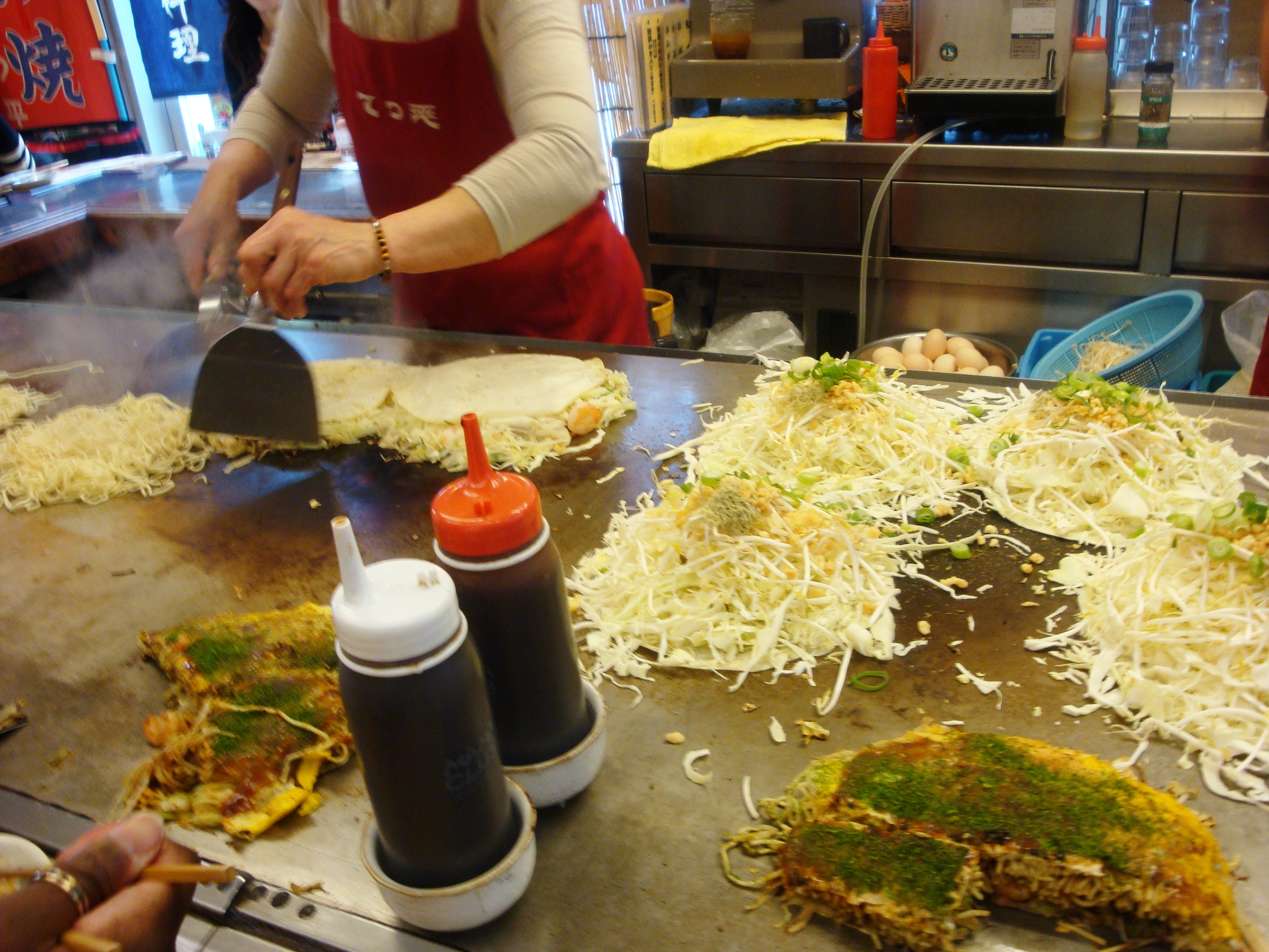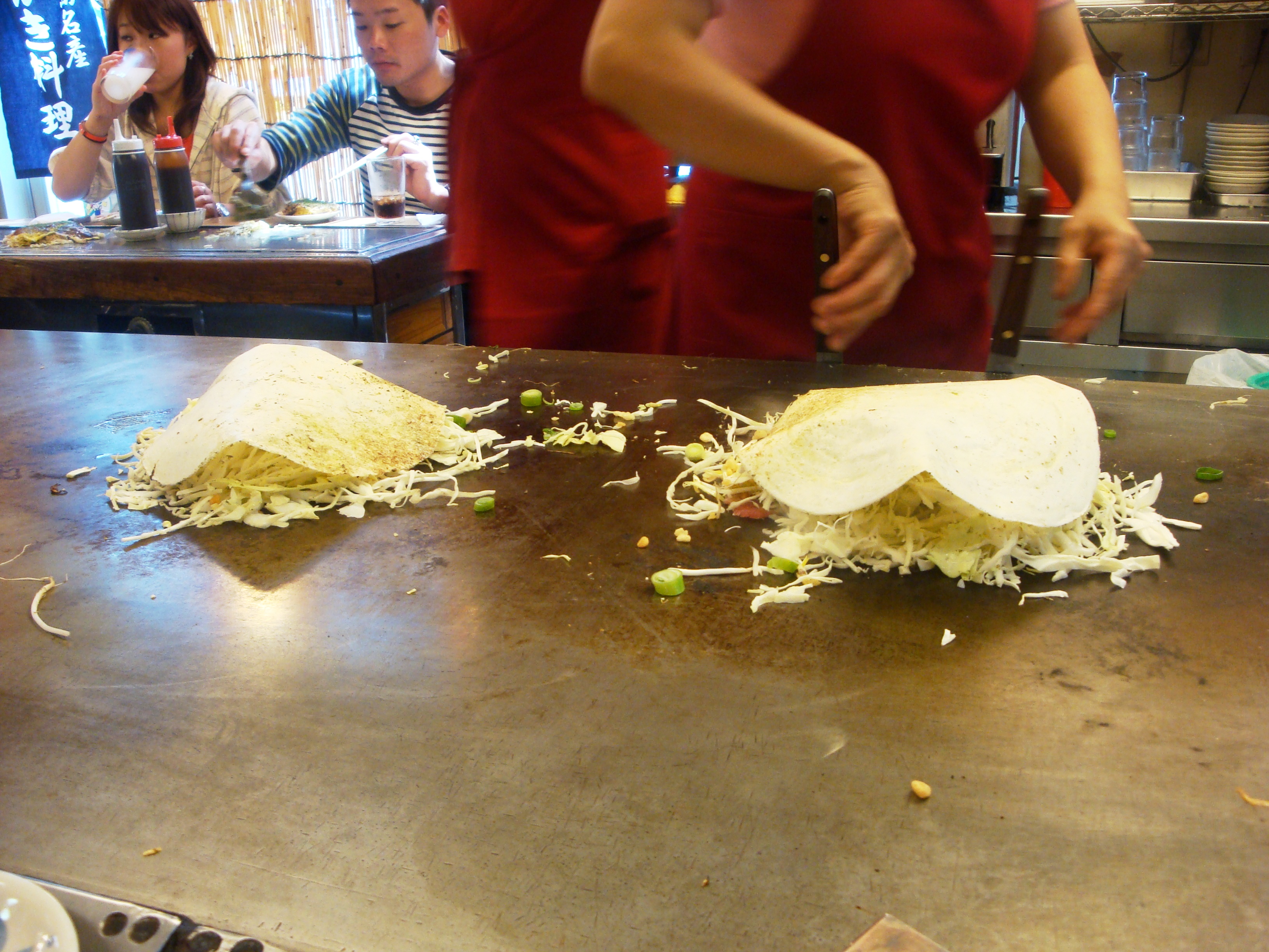 Essentially a mixture of whatever’s in your fridge cooked on a hot plate, the main ingredients include shredded cabbage, egg and a flour/yam based batter. Depending on your vendor, you could get noodles, pork belly (which looks like rashers of bacon in the photo below), shrimp, octopus, cheese or pretty much anything else thrown in. Osaka okonomiyaki are mixed up before cooking, whilst Hiroshima vendors will layer the ingredients as they cook.