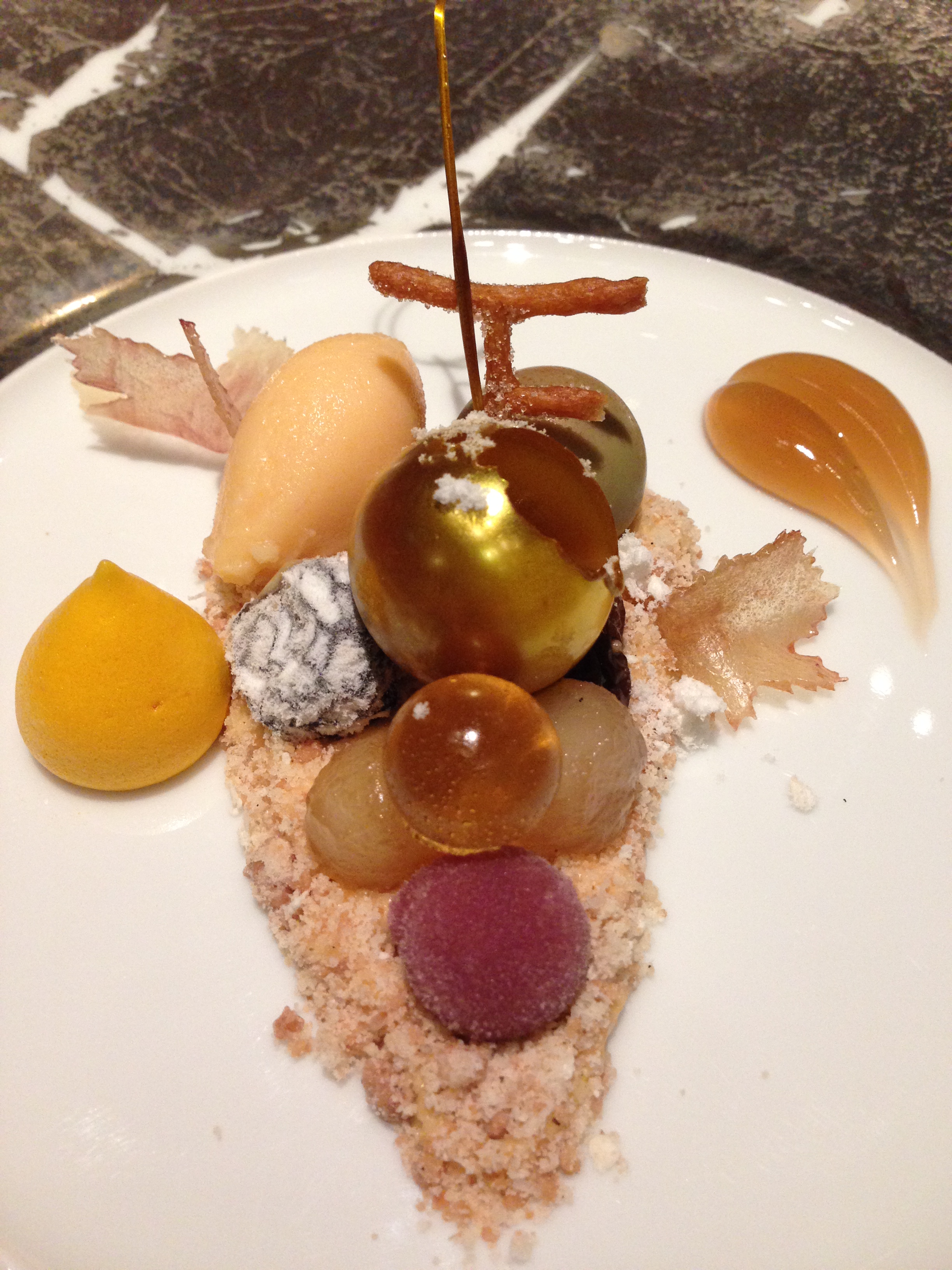 After our kitchen visit, it appears we have finally reached the dessert courses. A sparkling, glistening display of flavours are arranged on a plain white dish, reminiscent either of a bunch of grapes or a Christmas tree decoration. A gold bauble filled with a citrus cream; a dollop of apricot jelly; a sphere of nectarine mousse. A cheeky shrivelled grape coated with the botrytis mould that gives the botrytis riesling its unique flavour. Mind blowing and beautiful.