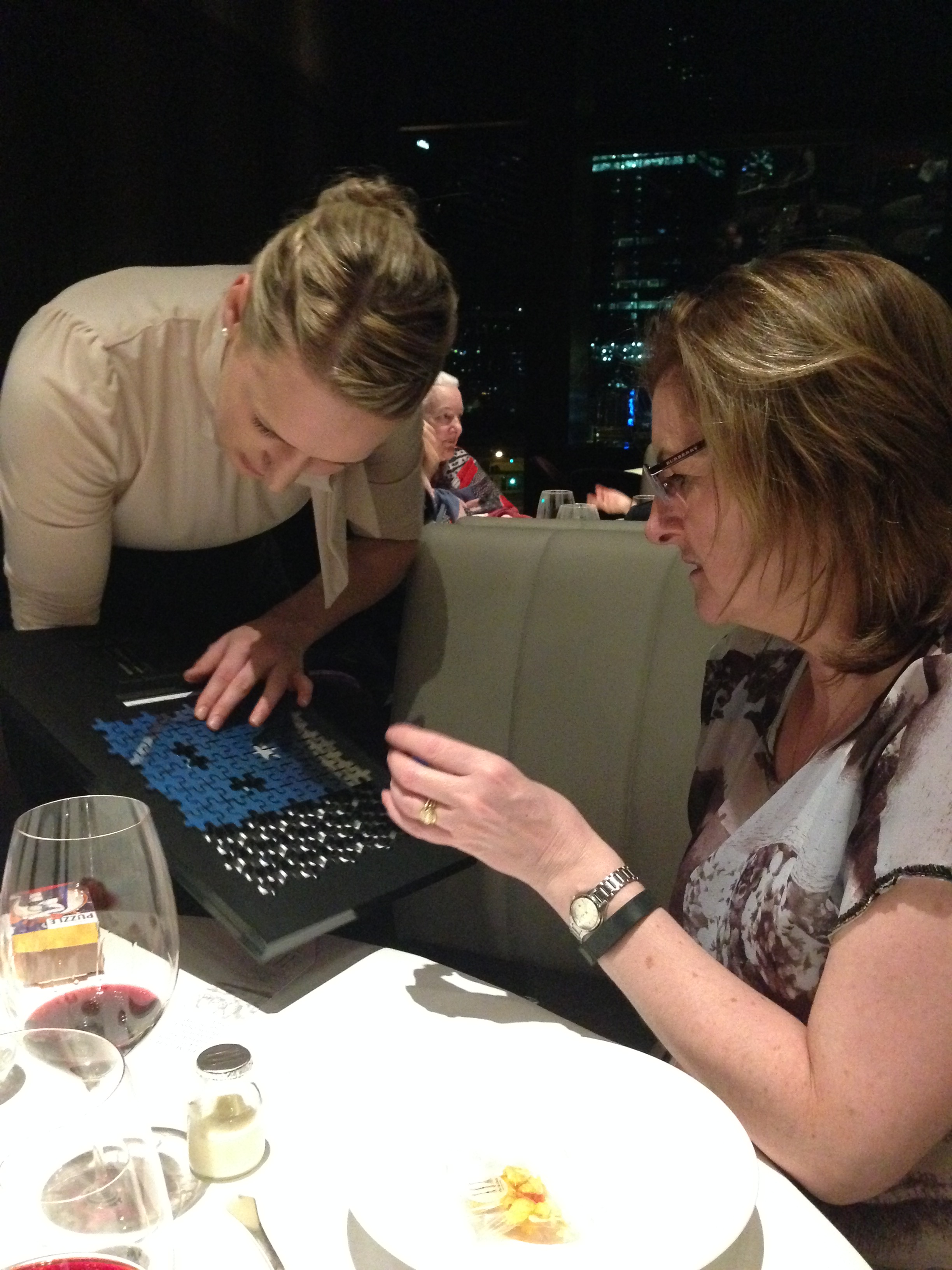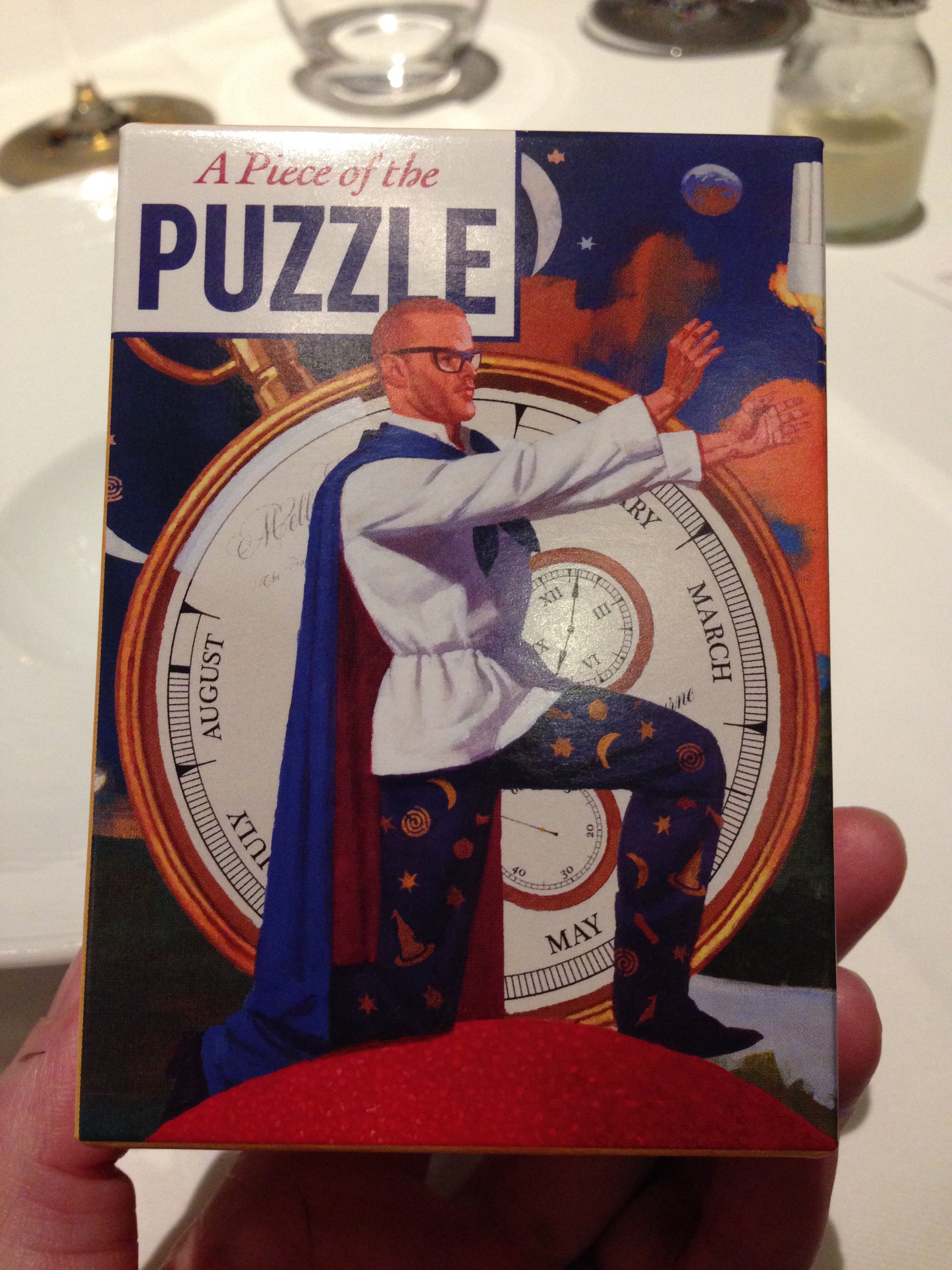 The extra touch is the free toy in each box: a piece of the enormous jigsaw puzzle slowly being assembled on the restaurant wall. Our server helps us find the spot on the section being put together tonight, with the aid of some tiny code numbers on the back. We are now officially part of Heston History.