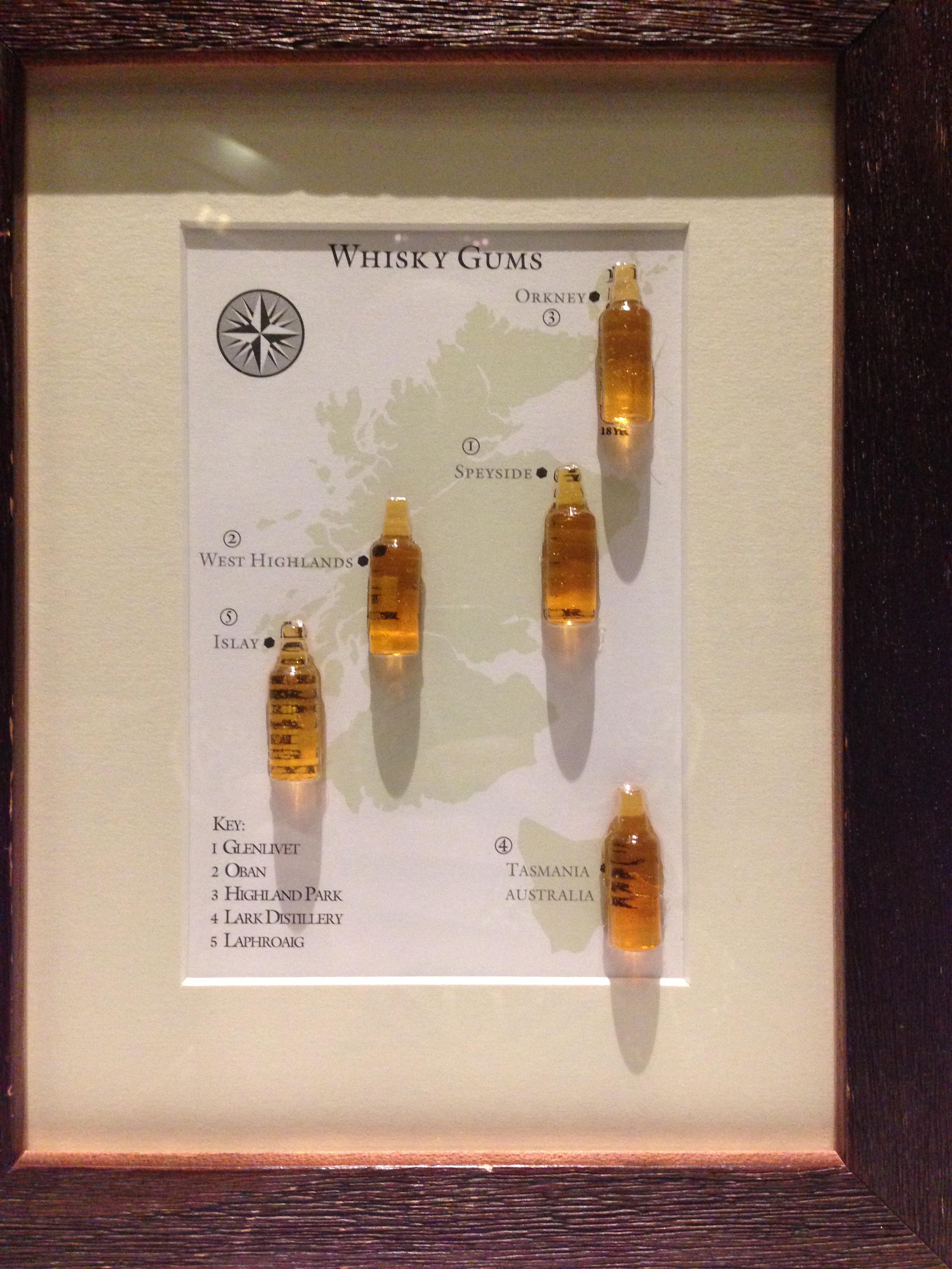 It’s almost one in the morning on a schoolnight. We’re exhausted and pretty full. What more could there be? A framed selection of whisky wine gums, that’s what, made from the whiskies of Glenlivet, Oban, Highland Park, Tasmania’s Lark Distillery and Laphroaig. To be consumed in that precise order, if you don’t mind. I don’t like whisky, but I like these.