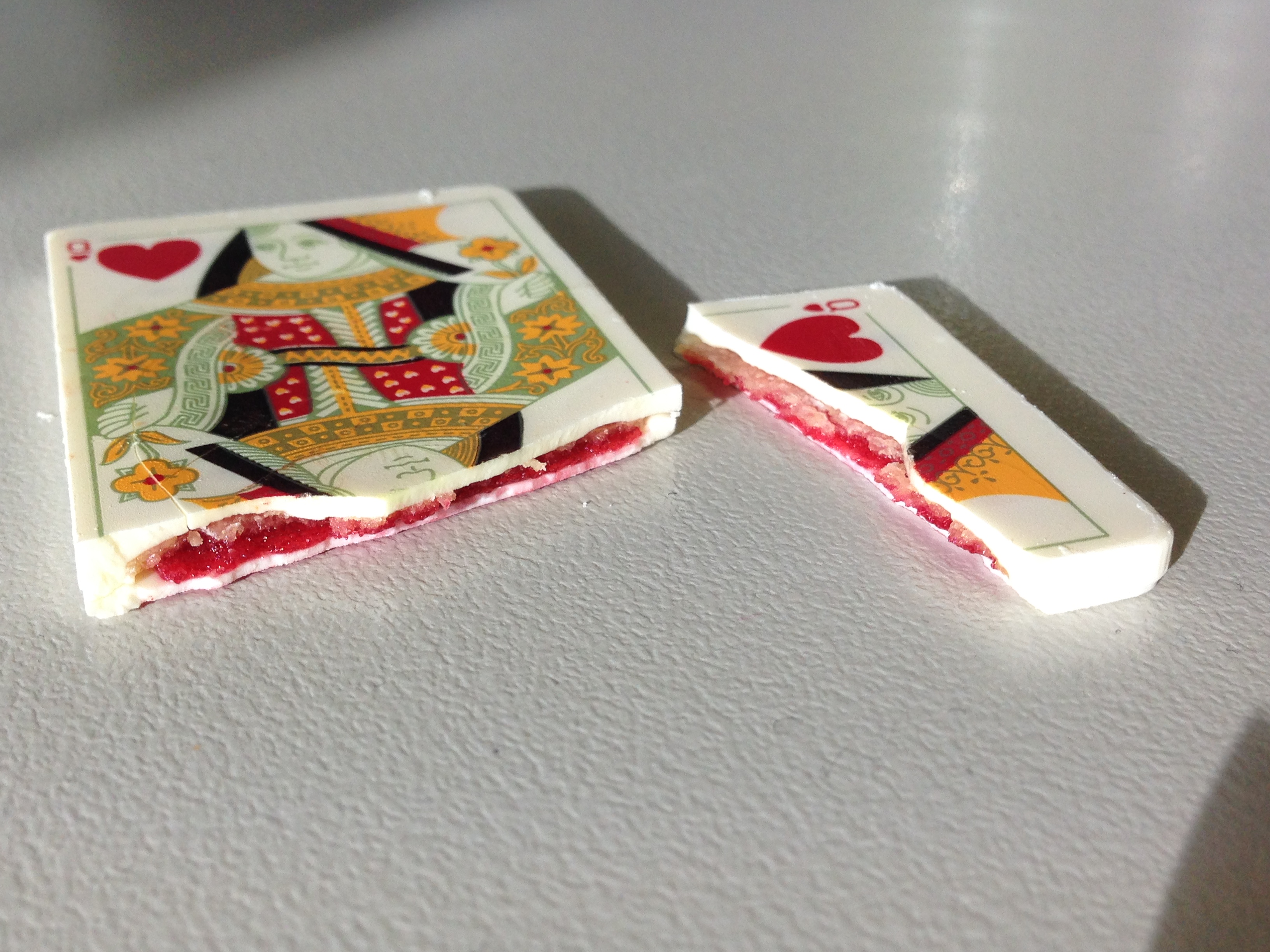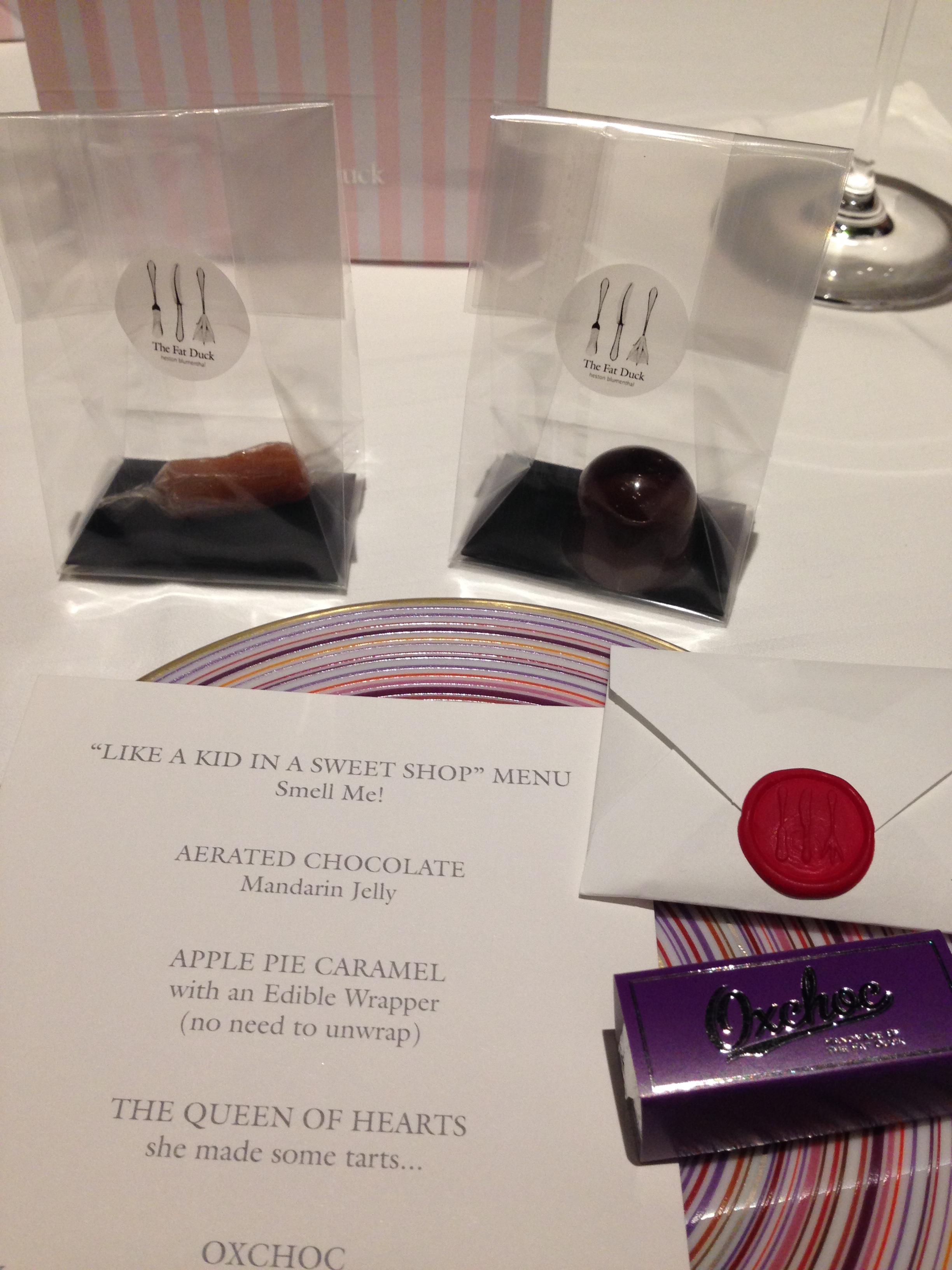 Finally, our tastebuds and our energy levels waning, the final flourish of wizardry. A pink and white striped candy bag appears for each diner, the bag itself infused with the unmistakable smell of an old-fashioned sweetshop. Inside, an aerated chocolate (Aero?), an apple pie caramel wrapped in edible cellophane, a “ox-choc” savoury chocolate and Heston’s famous Queen of Hearts snug inside a tiny waxed envelope. I manage three but hold on to the Queen, hoping for a quiet moment later in the week where I can savour her in private.