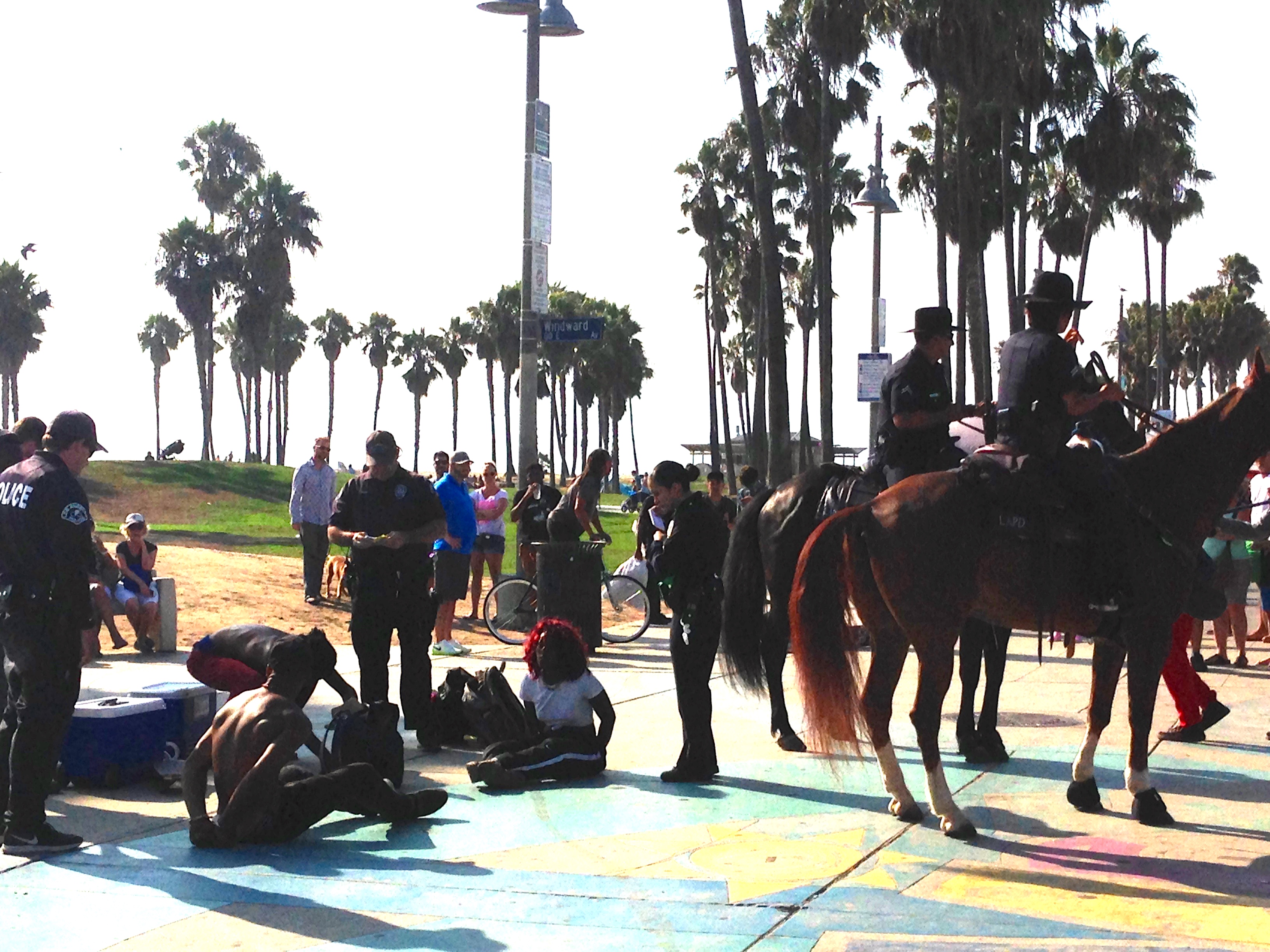 A small group of street performers near the skate park are being challenged by a couple of police officers. The performers look like young students, dressed in dance practice clothes. We’ve not seen the performance, nor can we understand what they are being arrested for, but they look a little bewildered and shocked rather than defiant or aggressive. The officers have already called for backup, it seems; within two or three minutes the original two officers are joined by another two on horseback and four more screaming to a halt in their cars.