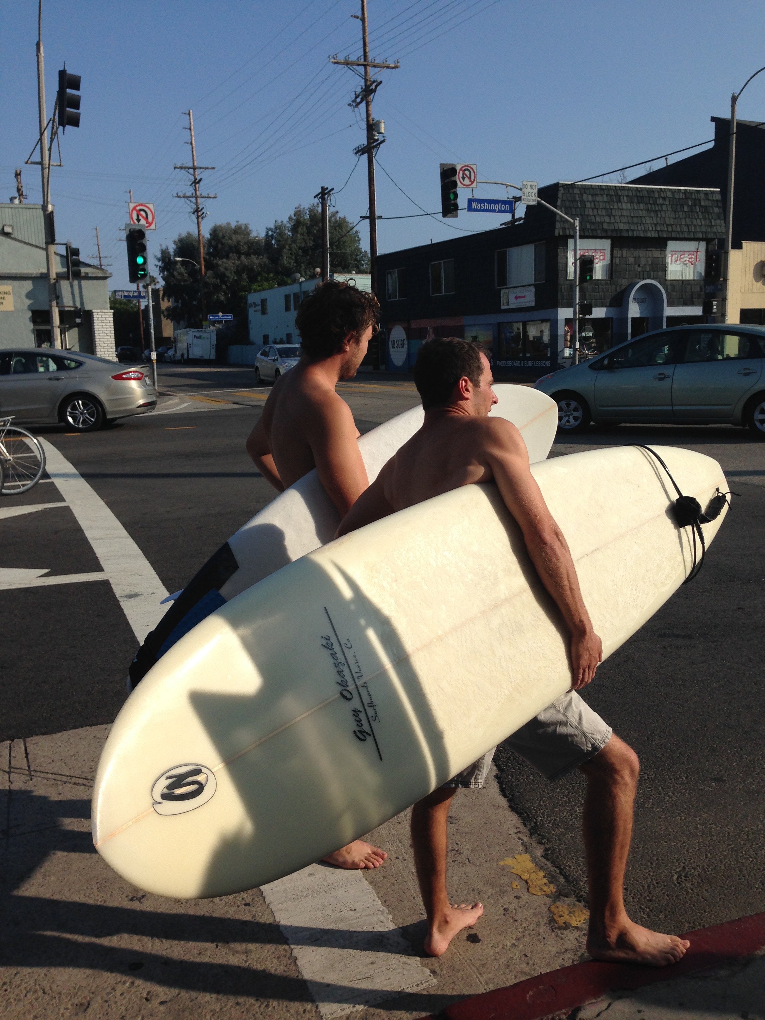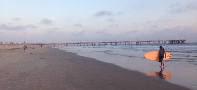 The wide sweep of the beach fans out behind us, the Santa Monica Mountains behind. It’s time to head back.