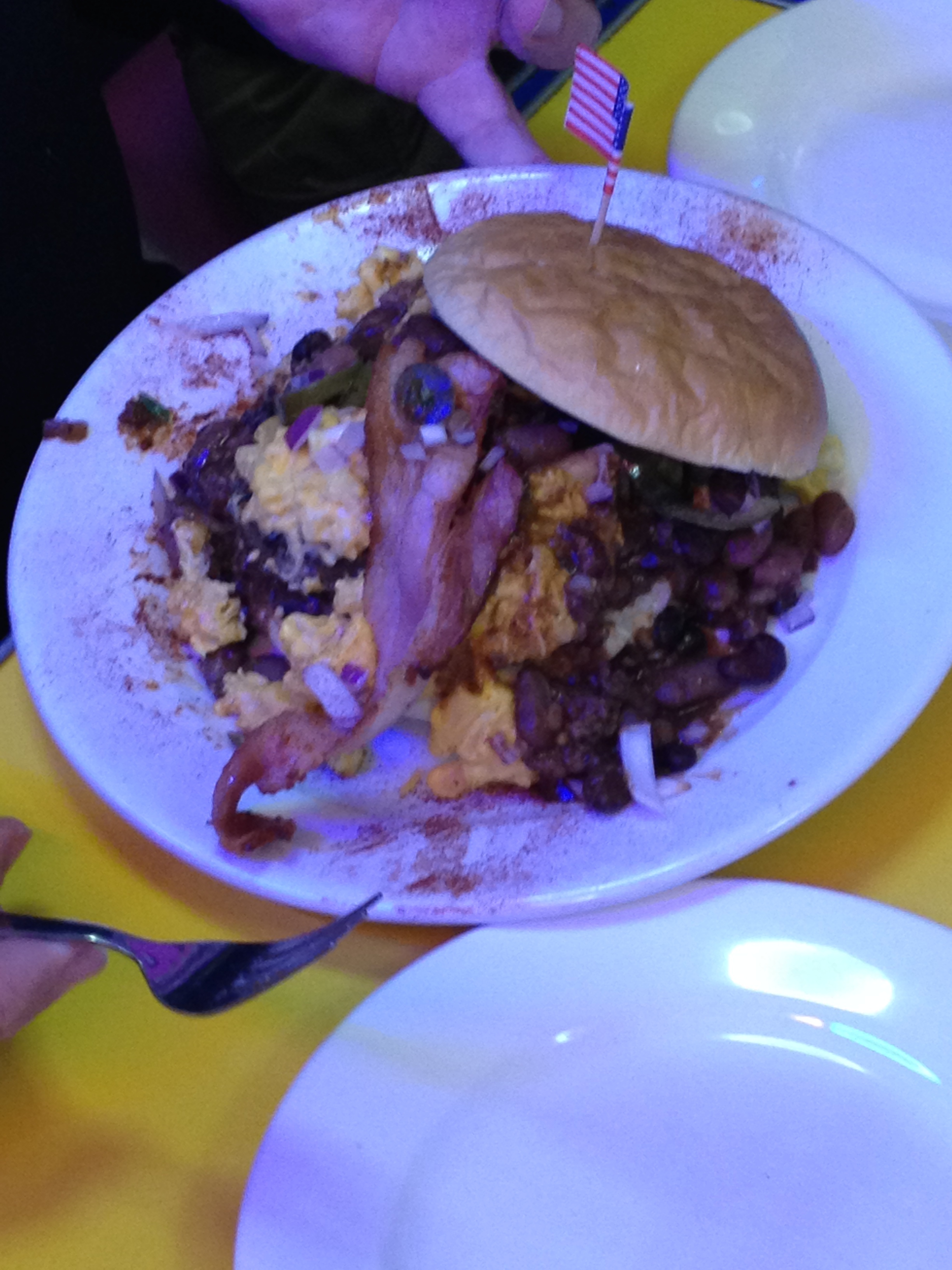 The menu was long and carb-loaded. Starters are a predictable mix of potato skins, corn chips, an onion ring tower and other deep-fried goodness. My gang went straight for the main courses. Burgers were high on the list, but I went with the “Get In My Belly”: personally recommended by Misty herself, it promised the heady combination of sliced smoked pork shoulder, spicy barbecue sauce and home-made coleslaw.