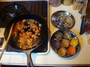 Add the star anise, cardamom, cloves, cinnamon, turmeric and both masalas. Stir vigorously and cook for 2-3 minutes. Add a little more olive oil to moisten if necessary.