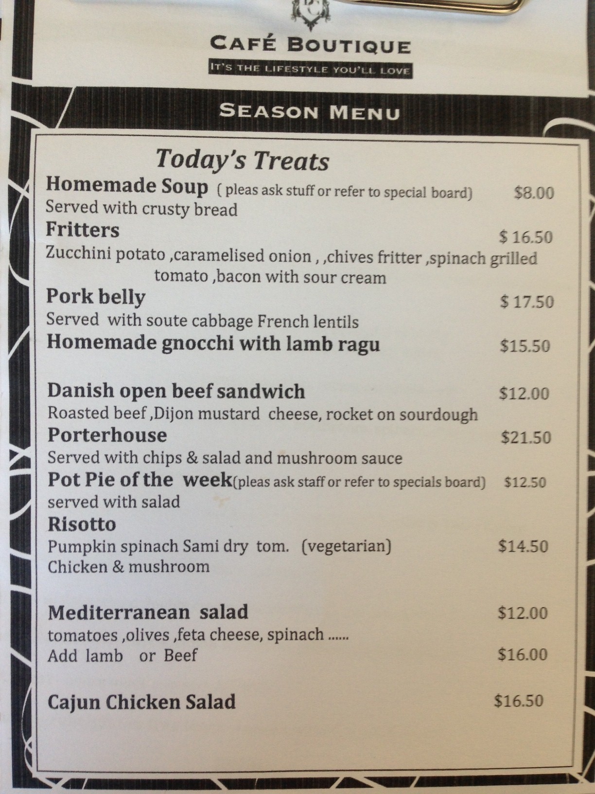 One gripe of mine that applies to many Melbourne restaurants and cafes: Cafe Boutique seems to ignore the fact that Melbourne has a moderate oceanic climate, not a sub-tropical one. This involves cool winters, people. It is staggering to me to find myself so frequently in eateries with no heating and doors or windows wide open in winter, creating icy wind-tunnels that chill both the diners and the food in no time flat. Sadly, Cafe Boutique is one such place, with a front door wedged open on one of the coldest days of the year, and the verandah door being used as a thoroughfare. I kept my overcoat on for the whole visit.